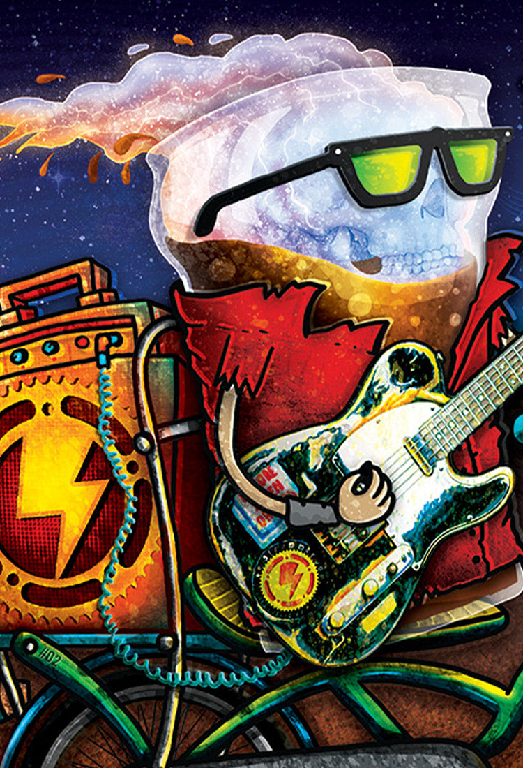 Developed a recurring series of "To-Go" beer labels for Hailey’s iconic bike-and-brew hub. By blending technical vector illustration with hand-drawn narrative themes—ranging from Joe Strummer homages to mechanical "x-ray" schematics—this project created a versatile packaging system that carries the restaurant’s brand into the wild.